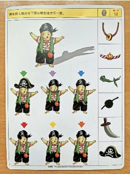 上次活动反思后,教师尝试用游戏的方式来调动孩子们的学习兴趣。因此,开展了“逻辑高”逻辑思维课程训练第三阶段《神射手“吉米”》中的一节活动《我是小海盗》,活动的重点是找出装扮不同的地方。