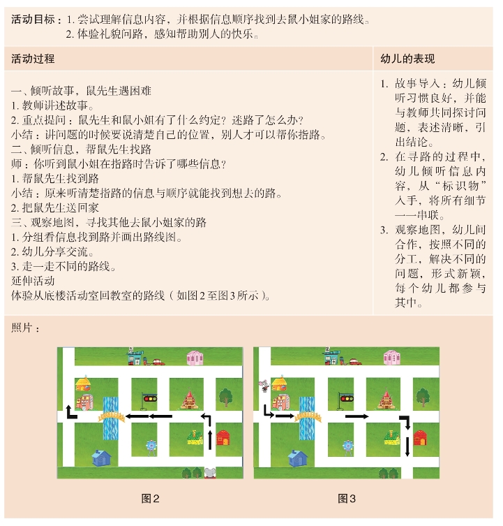 经过第三次尝试,教师改变了最初的游戏方法、游戏内容,由原先的“问路”改变成“打电话给鼠小姐”让它说出家的具体位置。我们也加大了难度,让鼠小姐一次说五个关键信息,并让幼儿记录。幼儿第一遍听时,只听到各种明显的标识物,比如:见到城堡、房子、医院等。于是,教师又播放了第二遍鼠小姐的电话,引导孩子补充完整所有的标识物。第三遍播放时重点提问“先经过哪里?再经过哪里?”,这样层层递进,帮助幼儿分析路况、理清空间方位。同时,我们也改变了最后的思维游戏,利用故事情节“让鼠先生回家”的开展,鼓励幼儿走一走,将电脑上的平面地图变成了生活中的立体地图。孩子们按小组人数分,有的拿地图、有的指挥、有的看路标,各司其职,体验初次合作的快乐。