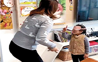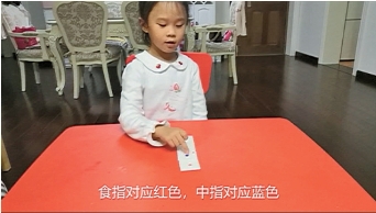 两种颜色卡片、食指对应红色、小指对应蓝色,把不同的卡片依次排列在桌子上、手指根据颜色对应依次点击卡片上的颜色。幼儿熟悉游戏后,可适当加快速度,或者播放幼儿喜欢的音乐,让幼儿跟着节奏点击颜色。