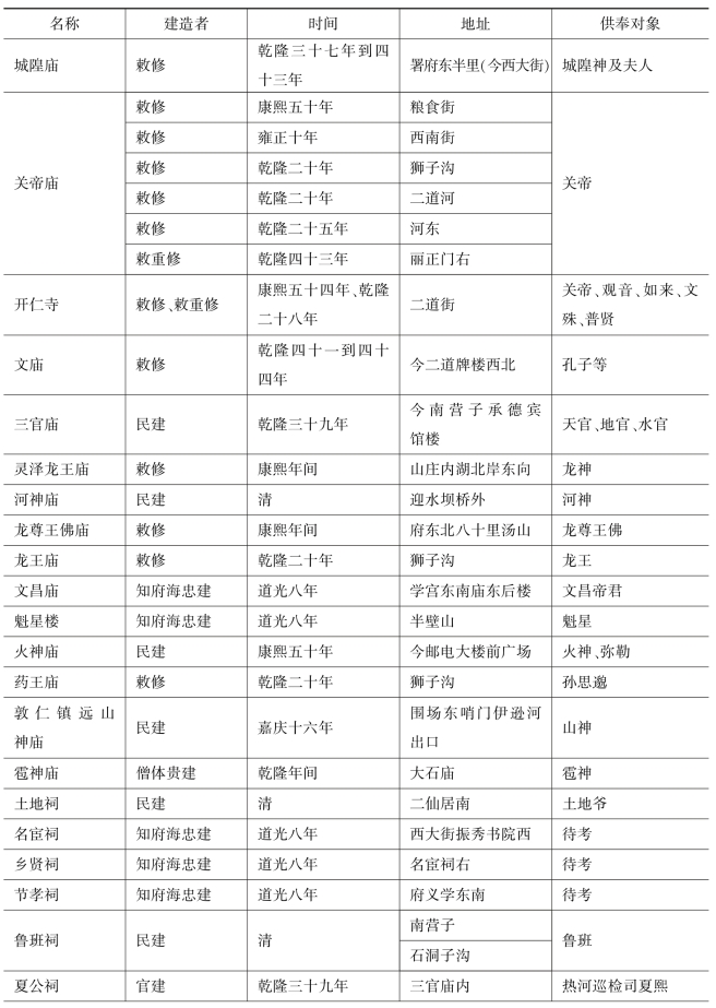 “古者有封建即有坛壝,境内之祭不以域外而忽。”清代在全国范围内兴建坛庙以供祭祀,边远偏僻地区也并不落后,如新疆、承德等地,建造坛庙的步伐与内地基本一致。正是由于特殊的地理位置以及城市兴起等因素,承德也逐渐恢复并修建一大批坛庙,供奉对象名目繁复,有自然神、动物神、人神以及众多有名或无名的神仙精怪,可谓五花八门,难以统括。据《热河志》《承德府志》等文献记载,清代承德地区坛庙数量众多,但多数记载语焉不详,为详细了解清代该地所建坛庙情况,兹据地方志书及本地学者论文将一些尚能提供线索的坛庙载录于下表,以便睹其概貌。