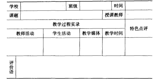 (2)实录评点。听课过程中可以参照下述(表2-1)所列的各项内容,尽可能完整地记录教学的主要环节,包括教师、学生的活动,教学所使用的媒体,各个环节的教学时间等。这里特别要强调的是,作为研究者,听课的过程实际就是研究的过程,星星点点的思维火花会不时闪现,而这里往往蕴含着许多富有价值的“长期思考、偶尔得之”的灵感思维成果;在事过境迁之后,又难以捕捉、再现。因之,在评点一栏内及时记录就尤为重要,这样会给课后的深入思考、研究以极大的便利。另外,教师的教学机智、艺术,常常体现于令人叹服的教学细节处理技巧中,可能是一个巧妙的设问,也可能是点石成金的解答,把这些妙处实录下来揣摩玩味实在是经验移植的有效途径。那种只有大的框架、环节的听课笔记,只能反映一节课轮廓的静态,教者的风格与特色不能充分体现,应说是明显的缺憾。
