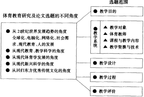 (图2-1)提出的选题模式,一方面列出体育教育改革、体育教学实验的研究课题,另一方面又列举了研究这些问题的不同角度,在二者的交叉中即可得到无穷的选题。