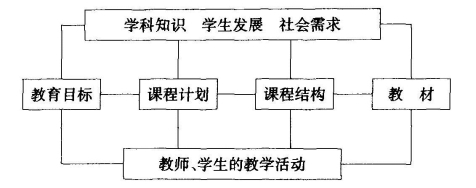 如(图6-3)所示,课程和教材设计来自三大基础:学科知识、学生个体的发展和社会需求不同的侧重则产生不同的课程体系。而近年来更注重于这三者之间的平衡与综合,然后形成一定的教育目标、相应的课程计划和课程结构。每一门课程的学科特点和地位,决定了教材的内容、结构和形式;同时也决定了这一学科特有的教学形式和教学方法,教师和学生的教学活动及其结果对以上各级都有一定的反馈作用,从而使教育系统具有一定的自我调节能力。
