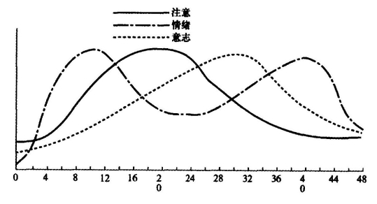 从心理负荷变化来看,心理负荷研究在我国正在起步,尚无理想研究结果。辽宁省所做的关于心理负荷的实验结果表明,心理负荷的“注意”、“情绪”、“意志’三项指标在课中不同时区的峰态变化一般趋势是,在45分钟的体育课中,学生的注意高峰出现在一节课的前区15分钟处,男女学生无显著差异,学生情绪高峰出现两次,第一次出现在课的前区4~18分钟,第二次出现在课的后部36~40分钟之后,学生意志高峰则出现在课中20~36分钟之间(图7-3)[18]。如果在学生注意与情绪心理最佳时区内安排学习和掌握各种知识和动作技术;在学生意志品质处于高峰期内进行锻炼,必然能获得较理想的效果。贯彻和运用合理安排负荷原则的基本要求: