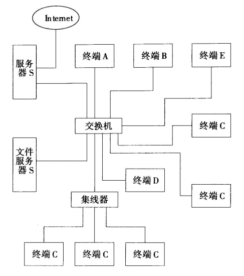 此外,还需交换机一台,集线器若干台,集线器用扩充网络机器。整个网络的结构如(图8-1)所示。