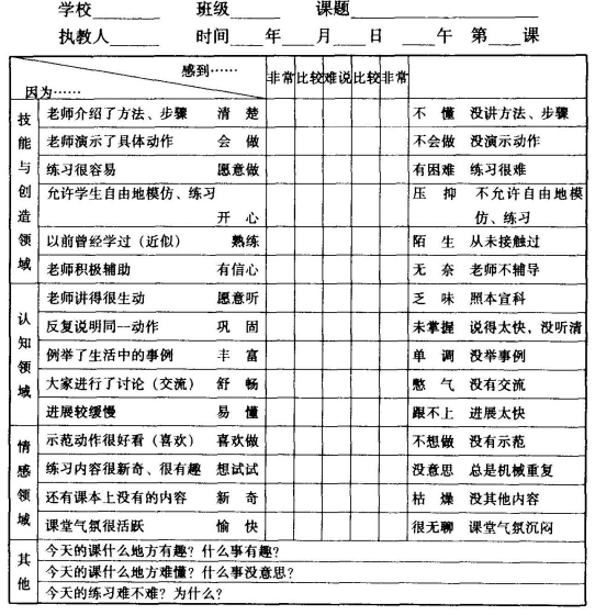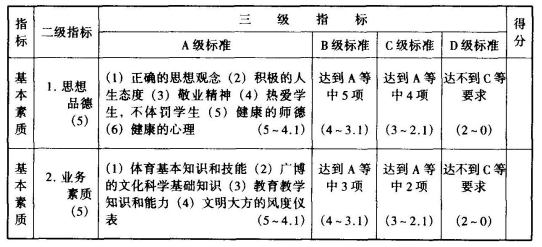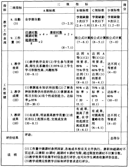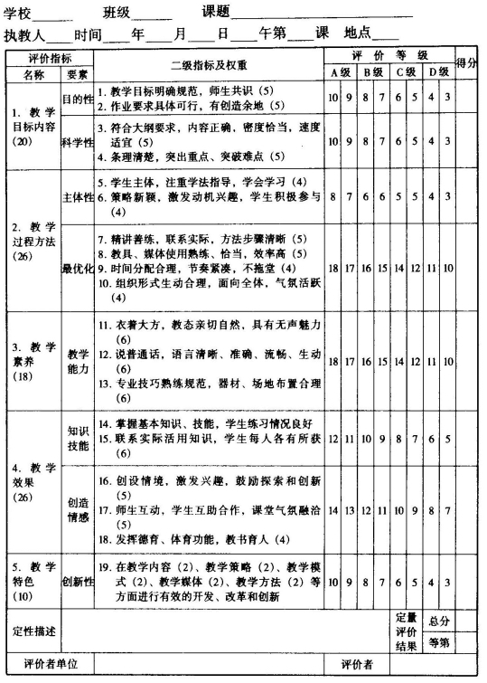 每个教师都有自己的教学设想、教学方法,通过备课、上课、辅导、学习反馈等,能对自己教学的优缺点作出客观的评价。对于一节课的自评可使用(表9-1)《体育课堂教学评价表》;到学期结束时,应使用(表9-3)《教师工作综合评价表》对自己的教学工作进行综合评价。(表9-1)是按二级指标确定分值,但又经合并成8大要素后进行评价,所以,项目少,易操作。但又列出了19项较具体的二级指标,便于评价者随时对照,所以仍然有较高的信度和效度。如果直接按19个二级指标来评价,那么一定会更加费时费力,不便操作。