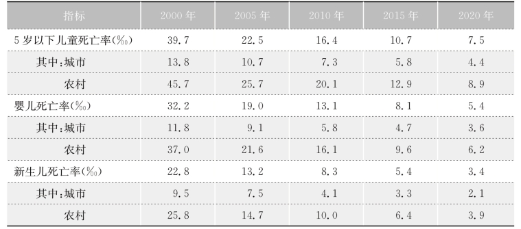 2000~2020年,我国5岁以下儿童死亡率、婴儿死亡率、新生儿死亡率和孕产妇死亡率都有大幅下降,在维护妇幼群体健康方面取得巨大成就(表1-2、1-3)。