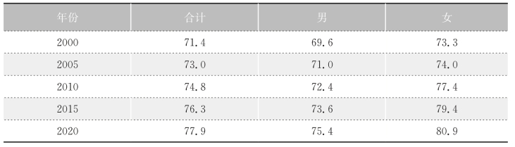 新中国成立以来,我国健康水平显著提高。人均期望寿命已由新中国成立前的35岁、1957年的57岁提高到2019年的77.3岁,仅用半个多世纪就将人口寿命延长了42岁,这在世界上是十分罕见的(表1-1)。
