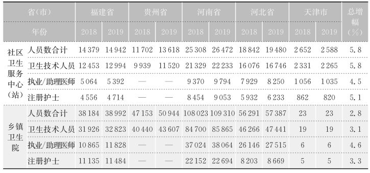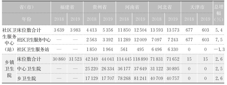 2018、2019年五省(市)基层医疗卫生机构床位数统计数据显示,基层医疗卫生机构床位数呈增长趋势,社区卫生服务中心(站)增长幅度为5.4%,乡镇卫生院增长幅度为2.6%。其中河北、天津社区卫生服务中心(站)床位数有所减少,特别是天津,床位由677张下降到603张,降幅为10.93%,福建、贵州和河南社区卫生服务中心(站)床位数均有所增加,其中贵州增幅达21.37%。说明五省(市)基层医疗卫生机构的床位投放有了明显提升(表2-53)。