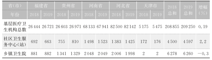 通过统计2018、2019年福建、贵州、河南、河北、天津基层医疗卫生服务情况,研究结果表明基层医疗卫生机构数、床位数、人员数总体呈现稳步上升趋势,基本公共卫生服务项目愈加完备,整体基层医疗卫生机构建设日趋完善。