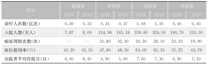 随着分级诊疗的推进,乡镇卫生院的诊疗人次数有所提高,基层医疗卫生机构的首诊作用得以凸显,保健和康复功能得以发挥。2018、2019年乡镇卫生院医疗服务统计数据显示,各省(市)诊疗人次数增长幅度在10%左右。其中,福建变化幅度最大,诊疗人次从0.30亿次上升到0.33亿次,增幅10.0%;贵州和河南增幅分别为8.8%和7.4%;河北基本保持稳定。2018、2019年福建和贵州乡镇卫生院入院人数有所增加,增幅分别为2.8%和7.6%;河南和河北入院人数有所下降,降幅分别为4.6%和18.3%,河北下降明显。结合其床位变化情况来看,乡镇卫生院床位数占比、入院人数均有下降趋势,且床位使用率下降,基层医疗卫生机构医疗业务萎缩。2018、2019年,病床周转次数和病床使用率变化趋势基本一致,福建和贵州呈小幅增长;河南降幅分别为7.3%和3.2%;河北有大幅下降趋势,降幅分别为17.4%和14.6%。2018、2019年,各省(市)出院者平均住院日均有所增加(表2-55)。