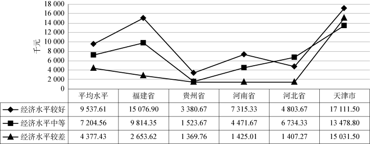 对五省(市)县级医疗机构的财政投入情况调查显示,基层医疗卫生机构财政投入受经济水平影响明显,无论是综合医院还是中医院,经济水平较好地区的财政投入普遍高于经济水平较差地区。例如,河南和河北两省的经济水平较好地区对综合医院的财政投入较多,经济水平中等和较差地区对综合医院的投入较少,并且经济水平越差,投入越少;经济较发达的福建、天津,无论是经济水平较好地区,还是较差地区,对中医医院的投入都比较多,并与经济水平基本成正比。