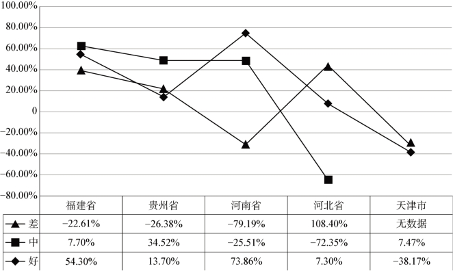 由于经济水平不同带来的财政投入差距在逐年加大,从2018、2019年财政投入对比情况分析,经济水平较好地区对中医医院的财政投入存在两极分化的现象。福建增幅达54.30%,天津降幅达-38.17%。经济水平中等地区中,河北对中医医院的财政投入降幅最为明显,达-72.35%。五省(市)经济水平较差地区中,除天津无数据外,福建、贵州、河南三省财政投入均呈下降趋势,唯有河北省注重基层中医医院发展,加大财政投入,增幅达108.40%(图3-3)。