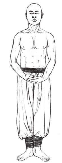 2.两脚尖外摆成八字步站立;两臂屈肘,两掌抱于小腹前,左掌心贴抱右掌背,掌心向上;双目微闭,舌舐上腭,意守丹田,静心调息。(图1-2)