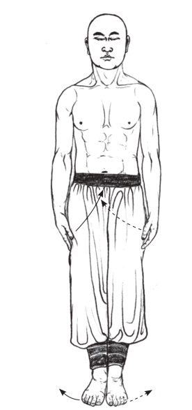 1.两脚并步正身直立,双臂自然垂于体侧,呼吸自然,目视身前一尺之地。(图1-1)