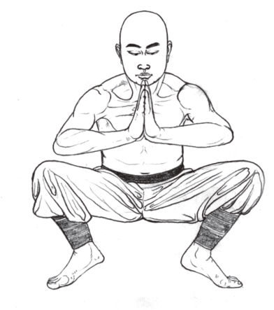 两脚开步比肩宽,脚尖外摆成八字,脚前掌、脚趾撑地,脚跟提起;双掌合于胸前。重心缓缓下沉,双腿屈膝蹲成马步,臀部尽量下坐;姿势摆好后,静心调息,共做38息。(图1-10)