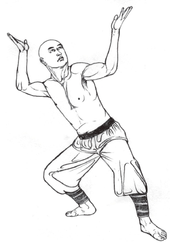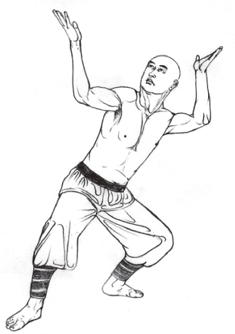 1.右半马步蹲立;两掌屈臂成托物状,略高于头部,两掌心向上,指尖分别向左右;仰头目视空中。姿势摆好后,静心调息,共做18息。(图1-19)