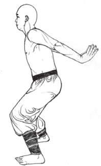7.两掌推出、收回3次后,收回双掌置于肋侧;目视前方。(图2-15)