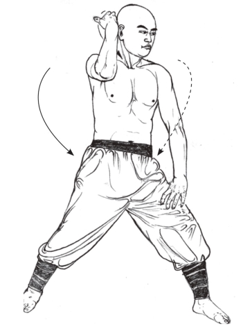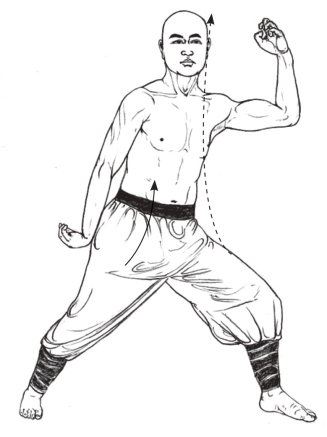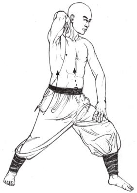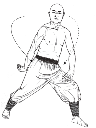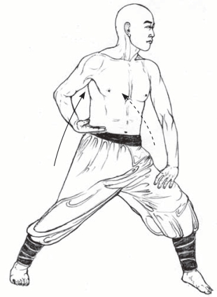 3.两臂后展到一定程度时,即转臂将两掌收至肋侧,掌心向上,指尖向前;目视前方。(图2-11)