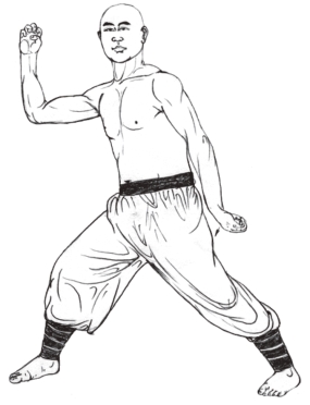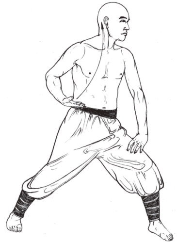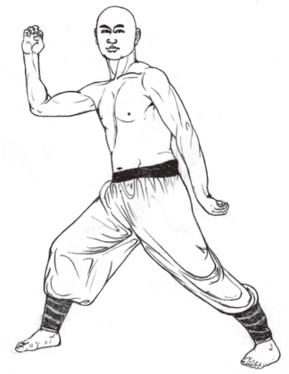 1.马步不变;两手握固,屈臂上抬于胸前,两肘平肩,拳面相对,拳心向下;同时,将气提至胸间;目视前方。(图2-22)