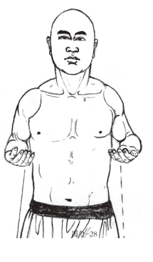 6.两拳伸指成掌,分开转下于胸前合掌,指尖向上,两拇指正对膻中穴;目视前方。(图2-28)