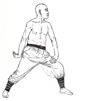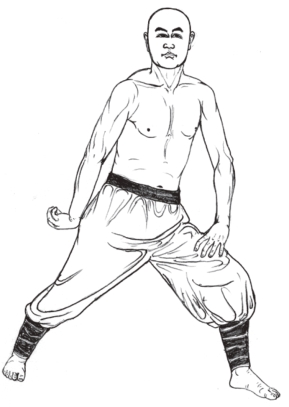 1.马步势不变,两脚尖外摆,斜向两侧蹲立;两拳握固后在胸前转一圈,右拳向前伸出,手臂微屈,拳眼向上,勾腕使拳心向面;同时,左拳向左侧后方伸出,要领与右拳相同;目视右拳。(图2-32)