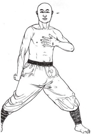 4.左右各换3次后,上体转正成马步;两拳平端置于胸前,拳心向下;目视前方。(图2-39)