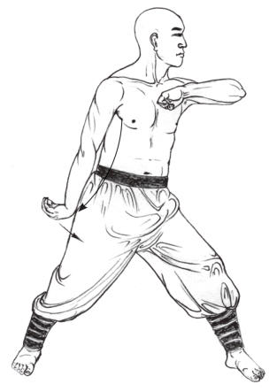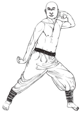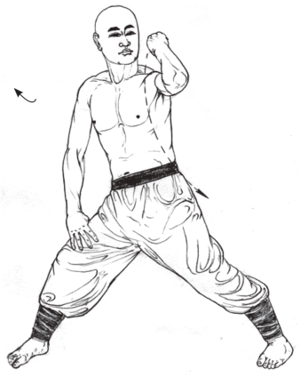 1.马步蹲立如前,右拳不变动;左拳五指张开,向左下、臀部外侧画弧成刁手。(图2-40)