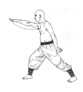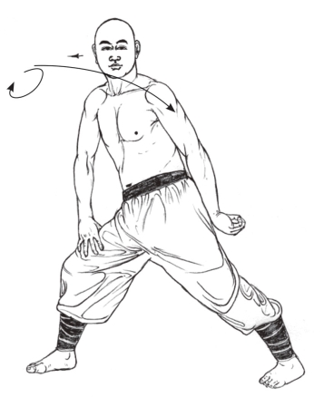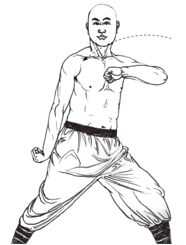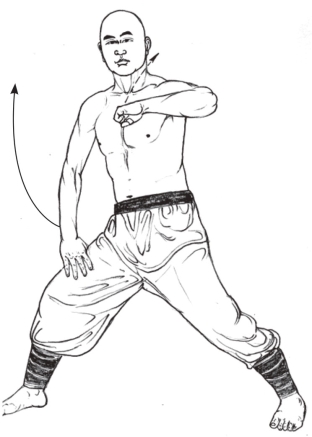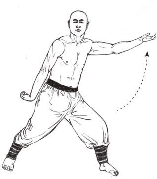 2.动作不停,左手继续向后画弧,直至极限,掌心、肘尖向上;目视前方。(图2-41)