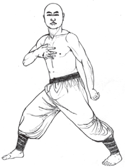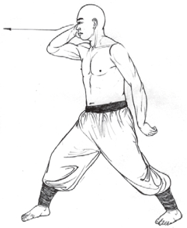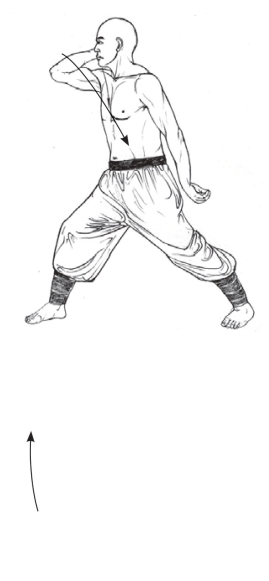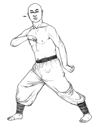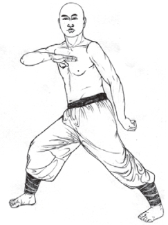5.收左脚,与右脚平行站立,间距宽于肩,成马步蹲立;同时,左拳收回胸前,两拳面相对;目视前方。(图2-55)