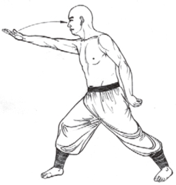 1.承接上势最后一动作,两手握固,左脚向正前方跨出一步,屈膝成左弓步;同时,右拳上抬屈臂置于右胸前,肘臂平肩,拳心向下,拳眼向里;左拳伸臂向前方击出,拳心向下;目视左拳。(图2-49)
