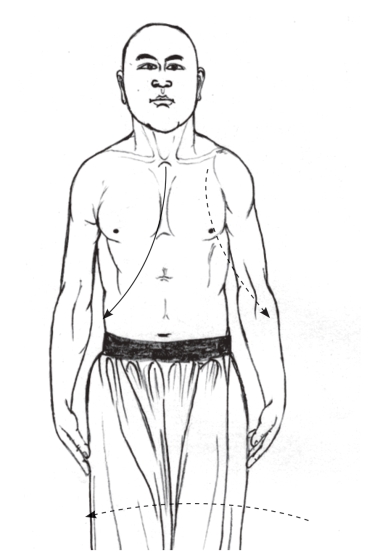 4.松拳成掌,放下,自然垂于体侧;左脚收步于右脚内侧,成立正势;呼吸自然,目视前方。(图2-59)