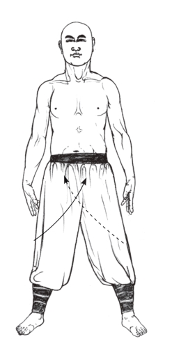 3.左右各开弓势六个轮回后(六六三十六次),将双拳收置于胸前,两臂平肩,拳心向下;目视前方。(图2-58)