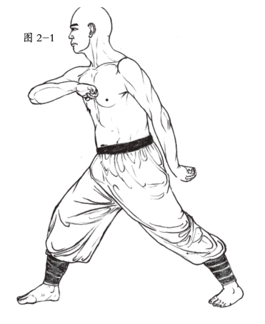 2.接着,前伸左拳,后拉右拳,要领与前势相同,唯方向相反。(图2-57)