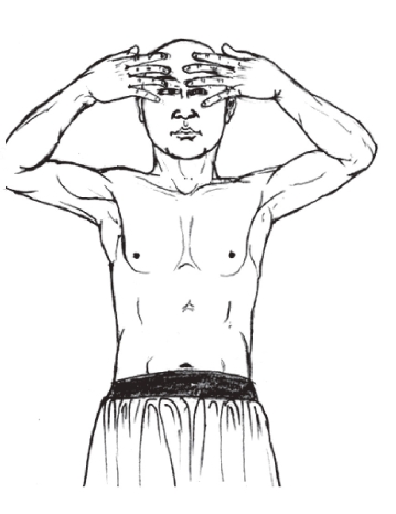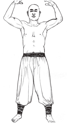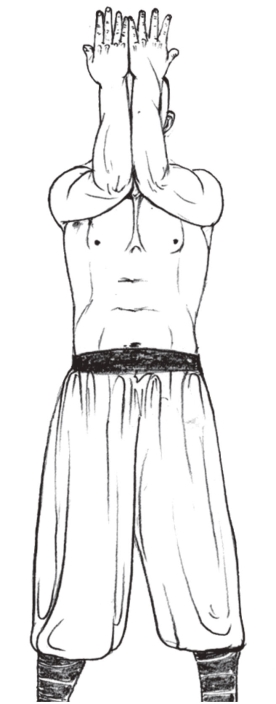 1.两脚跟略外展,两脚平行站立;双手握固,前俯身,上身与腿面夹角约成90度,两臂下垂与腿面平行,拳心对两小腿前胫。(图2-69)