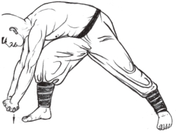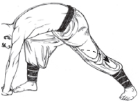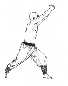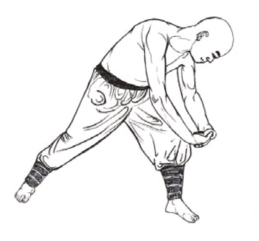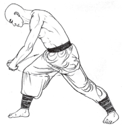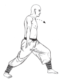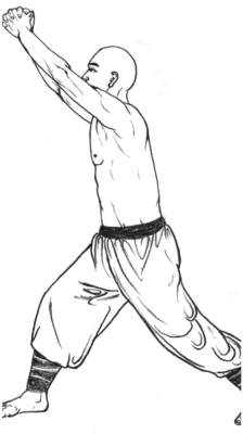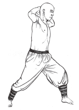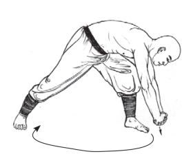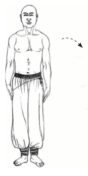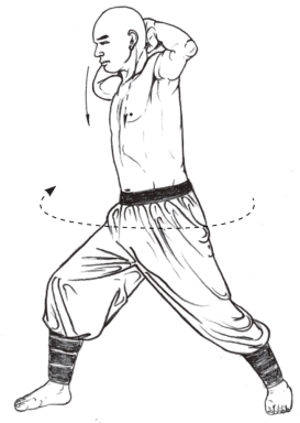 2.下盘动作不变,上体向左扭转,到最大限度;目视左后侧向右后侧注视。(图2-81)