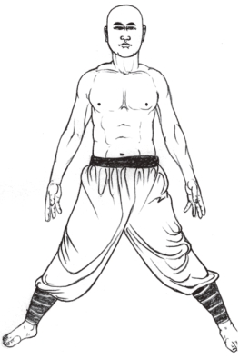 1.承接上势最后一动,两手放下成自然掌垂于体侧;左脚斜进一步,成丁字步(一顺一斜);目视前方。(图2-80)