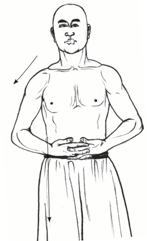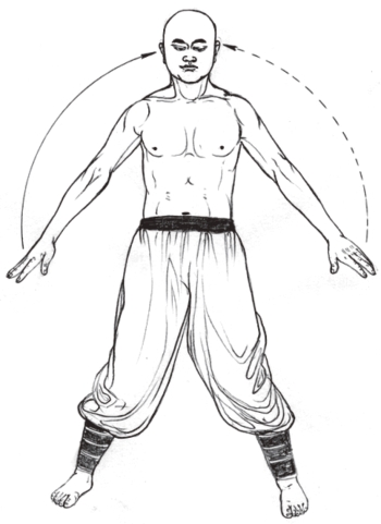 5.左右各练习3次后,放下两手自然垂于体侧;两脚开步正身直立,目视前方。(图2-105)