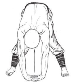 2.重心缓缓下沉,左膝屈蹲,右膝跪地;两手抱住右小腿前胫不放,上身略前俯;目视地面。(图2-99)