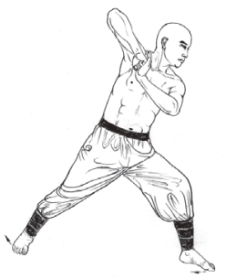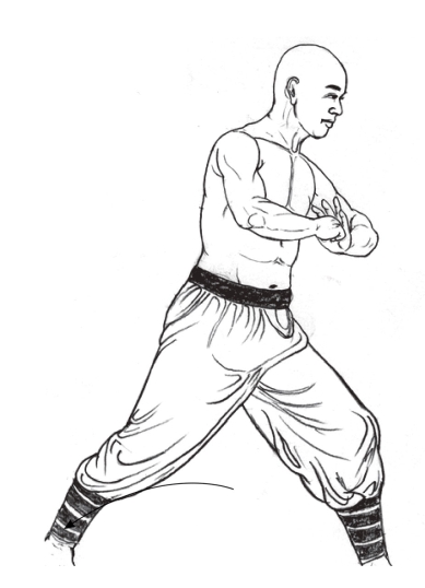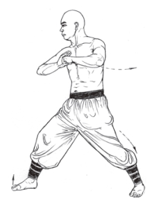 2.左脚收步于右脚内侧,屈膝下蹲,右脚提起脚跟成丁步;上体右转,两拳置于胸前,拳心向下,两前臂平胸;目视左前下方。(图2-132)
