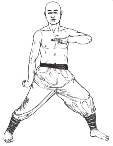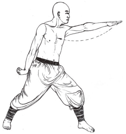 1.左掌向左伸出,手臂伸直与肩平,掌心向下,指尖向左;目视左掌。(图3-35)