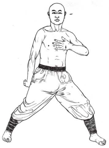 3.左掌外旋,掌心对胸,虎口向上;然后,吞气1口。(图3-37)