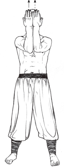 5.两拳伸指成掌,腕内旋成掌心向前,拇指相并,同时上伸至额前。(图3-74)