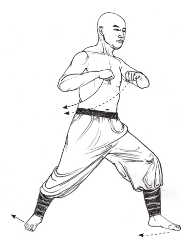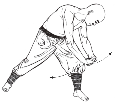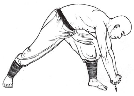 4.两手直臂向左脚前地面下落,弯腰俯身,两虎口向前;目视地面。(图3-83)