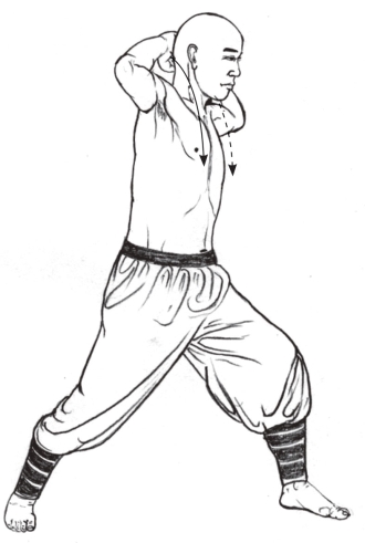 8.两掌向左右上抬,屈臂,两掌绕耳,贴于脑后。(图3-87)