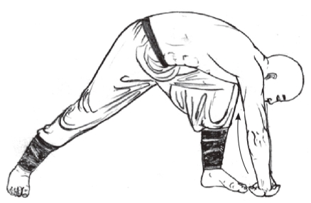 5.两掌翻转(双手十指仍交叉),掌心撑地于左脚尖前。(图3-84)