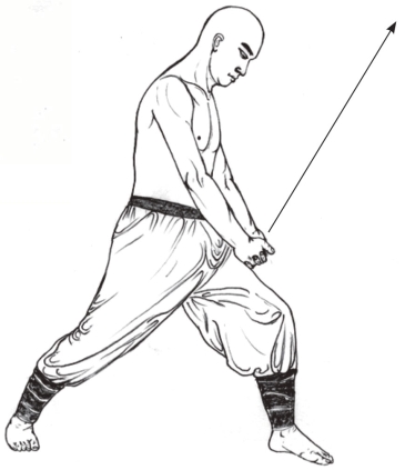 3.两臂用力向头顶上方提举,至两臂伸直,两掌心相贴;目视双手。(图3-82)