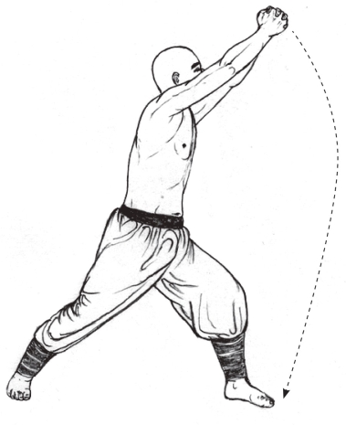 9.两掌于耳后屈指握拳,过肩下收于胸前,肘臂成环状,两拳面遥遥相对,拳心向下;目视左前方;然后,吞气1口。(图3-88)
