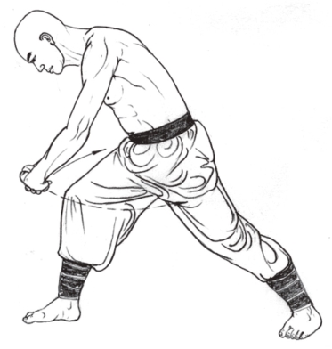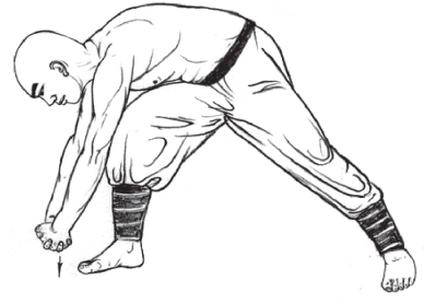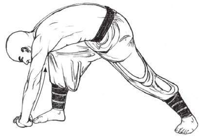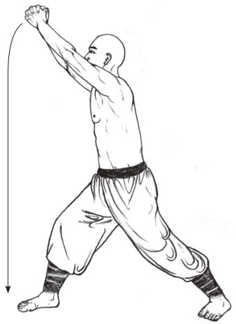 2.左右各做3次,共吞气6口。动作完成后,转体面向正前方,两拳成掌下垂于体侧。(图3-97)
