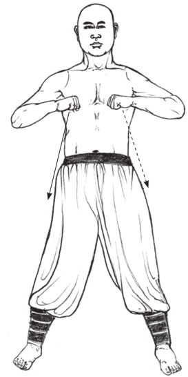 9.屈指握拳,下收胸前,两肘臂如环抱状,拳心向下,两拳眼对两乳;目视前方,正面(竖项端正头面),吞气1口。(图3-107)